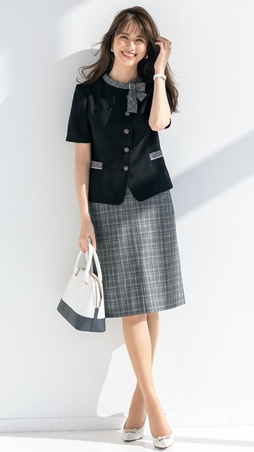 個人で事務服を買って職場で着ているのですが比較的手持ちのボトムスに合わせやすかったです。