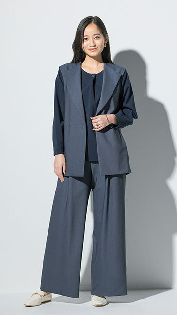 デニム見え素材がちょうどいいおしゃれワイドパンツ。裏地をつけていないため、暑い夏でも快適。”どことなくデニムっぽい”適度なリラックス感をまといつつ、ラフになりすぎない上品な色使いで、仕事に欠かせないきちんと感を保ちます。