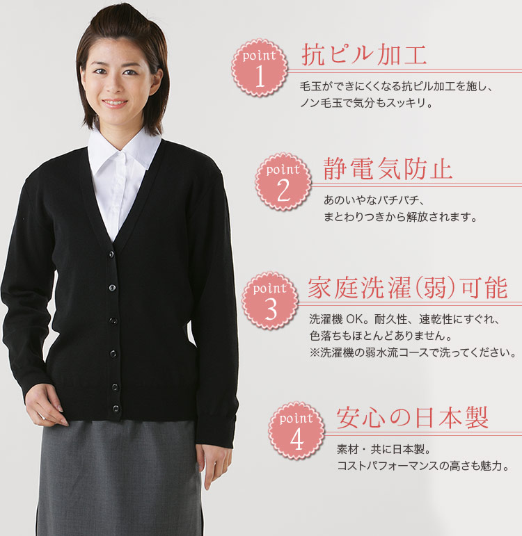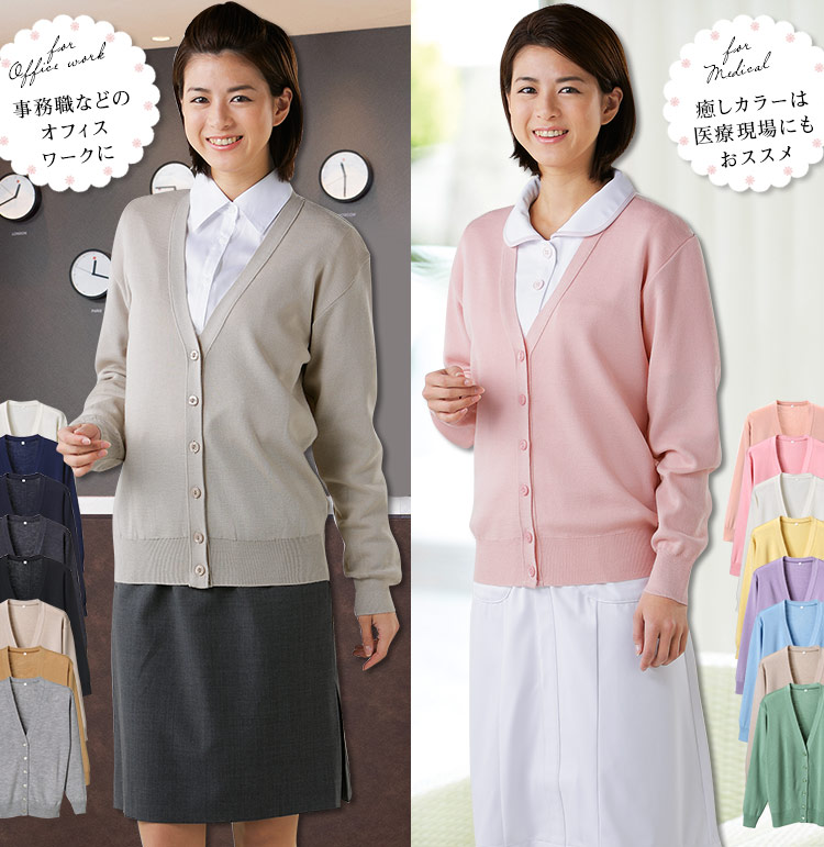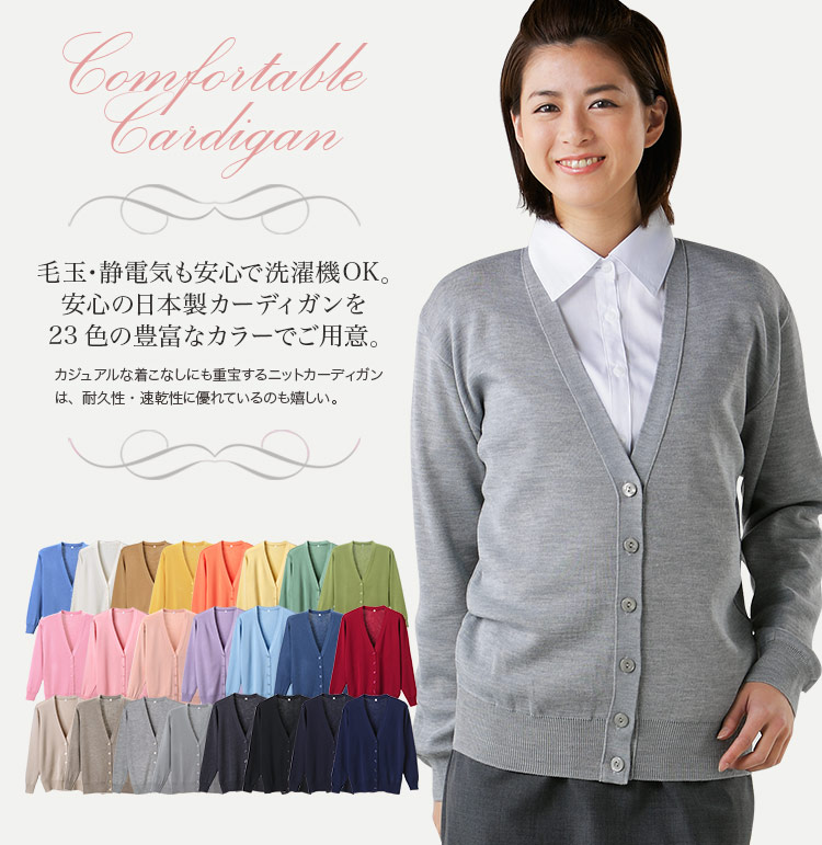 16色の選べるカーディガンは、安心の日本製。豊富なカラーで毎日の仕事が楽しくなります。イージーケアで洗濯機OK!機能性も高くオススメです。