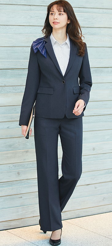 シルエットが美しいネイビーの美脚パンツ。ウールライクな見た目に快適なストレッチや吸汗速乾性がありお手入れも簡単!ジャケットやベストとのスーツスタイルもおすすめです。