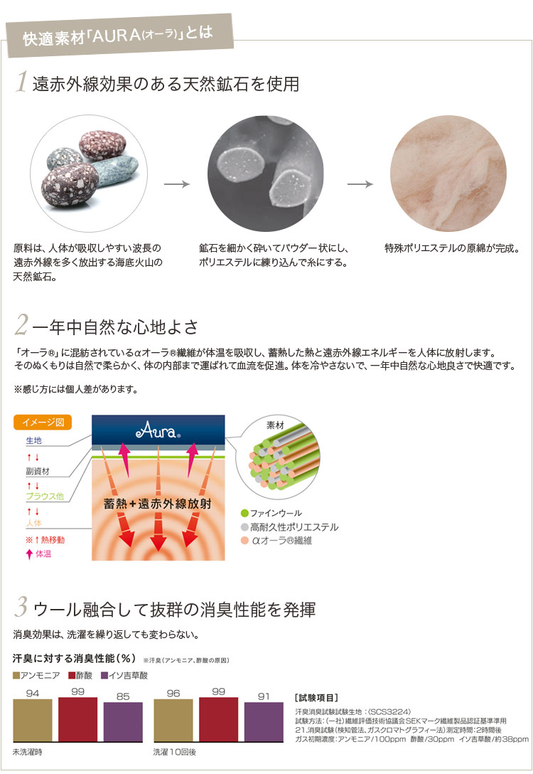 年齢にも職種にも左右されず、すべての女性が美しく着こなせるように考えられたユニフォーム、オーラ®。計算されたシルエットに加え、火山性深海石が赤外線効果を発揮します。 自分の熱で一年中心地良く、エアコンに頼りすぎず快適に過ごせるエコ素材です。