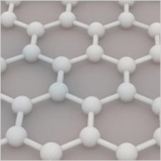 強固に繋がる6角形の分子構造をもつカーボンの仲間。この1枚の分子が「グラフェン」。ダイヤモンドよりも硬くて軽いといわれ、衛星や太陽光パネルにも使用されています。