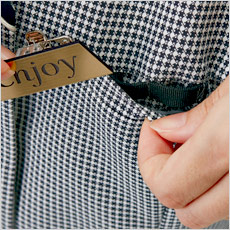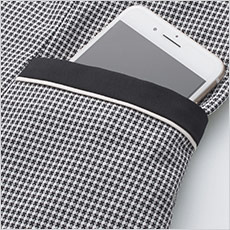 信頼感と落ち着きのある印象の小柄のチェック。凹凸のある生地はサラッとした肌あたりで、快適な着心地。