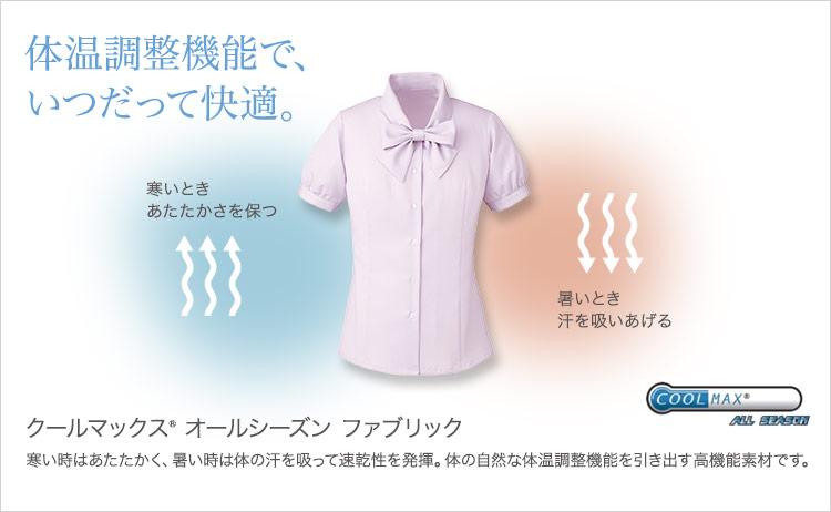 腕を真上に上げても、前後にぐるぐる回してもラクラク。裾がスカートからはみ出しにくく、胸元にシワが寄るのを防ぐから、着くずれの不安もありません。