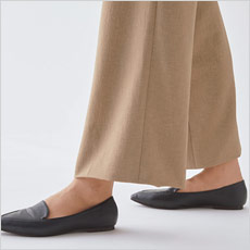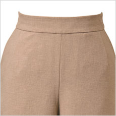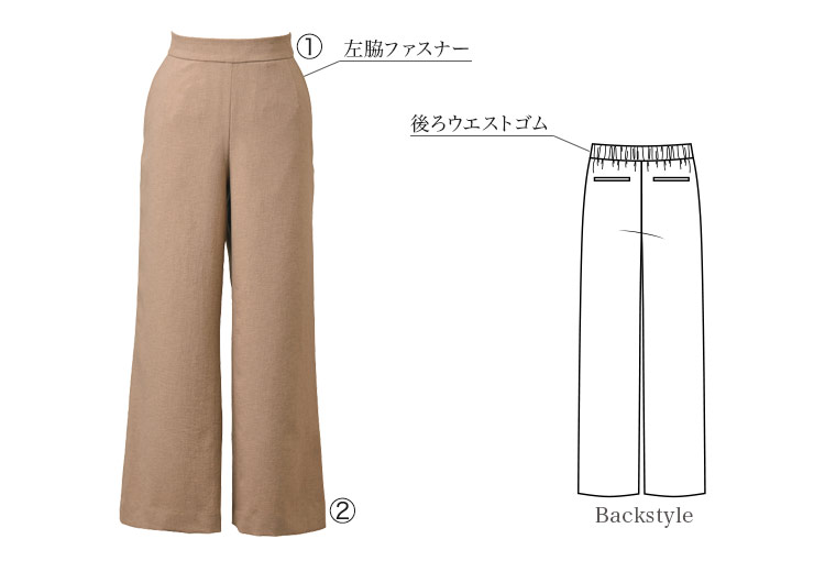 - すべり止めテープ、後ろウエストゴム、大容量ポケット、左脇ファスナー、Wカン、ストレッチ裏地、カーブベルト、くるぶし上丈