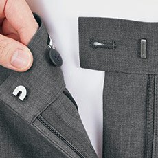 - 打ち込みホック、ストレッチ裏地、大容量ポケット、すべり止め