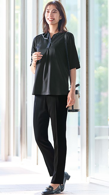 夏の汗じみストレスを解消してくれるオフィスポロシャツ。UVカット効果で透けにくいのも嬉しい。付属のアクセサリーでおもてなしもOKな華やぎ感。