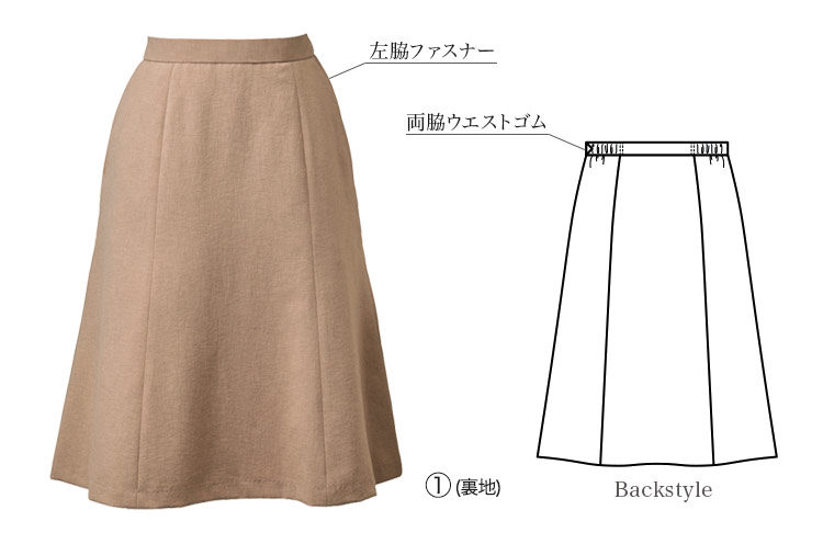 - 両脇ウエストゴム、三段カン、左脇ファスナー、吹き出し防止、ストレッチ裏地、すべり止めテープ