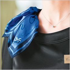 スカーフループに通すだけできれいな形が完成するスカーフループ。首に巻かないので快適。