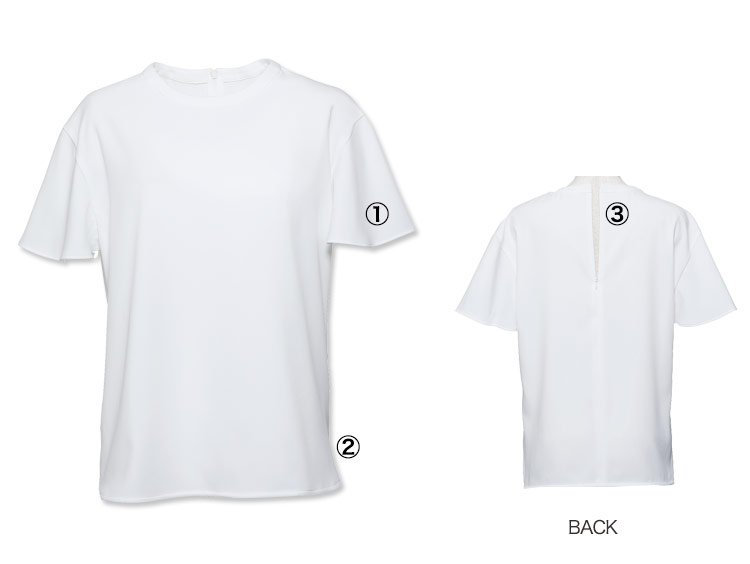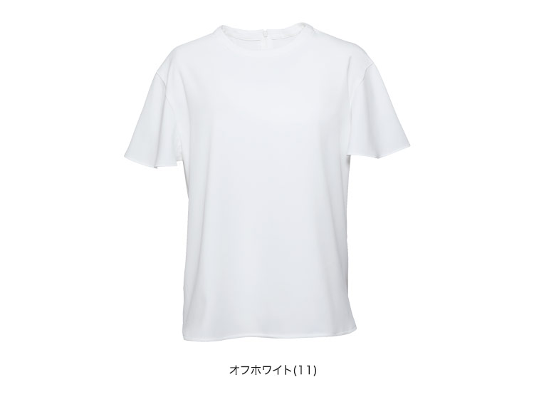 適度なドレープ性とハリ感のあるストレッチ素材。吸水拡散性に優れた「セオ・アルファ」が、さらりとした肌触りを生み出します。フルダル糸を使っているため薄手でありながら透けにくいです。洗濯後の乾きが早く扱いやすい素材です。