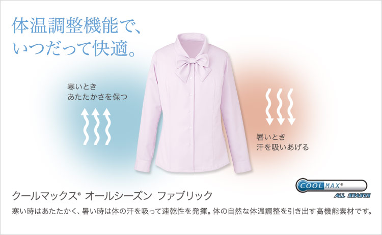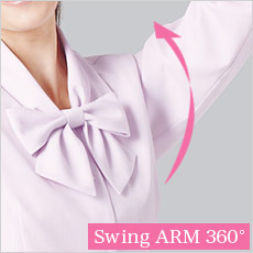 腕を真上に上げても、前後にぐるぐる回してもラクラク。裾がスカートからはみ出しにくく、胸元にシワが寄るのを防ぐから、着くずれの不安もありません。