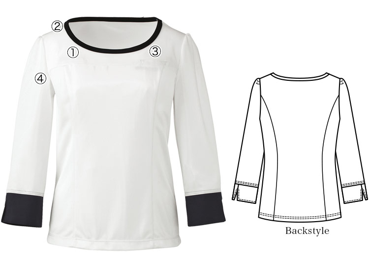 サービスシーンで活躍するプロのために生まれた「Noir TOPS」セレクション。華やかなツヤ感と首もとと袖口の配色でスタイリッシュに着こなせる七分袖プルオーバー。優秀な機能性で快適性も保ちます。