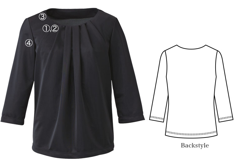 サービスシーンで活躍するプロのために生まれた「Noir TOPS」セレクション。サテンの光沢と胸元のタックが華やかなプルオーバー。優秀な機能性で快適性も保ちます。