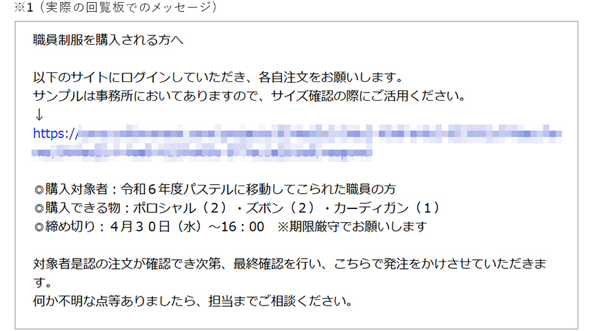 新しいシステムを使いますと口頭で周知をした後、パソコンから見れる回覧板(※1)に説明と使い方を書きました。あとは、各部門でも周知を行いました。