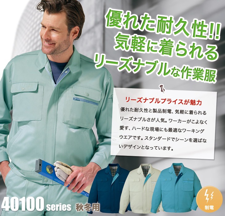 作早2015AW,40100,長袖ブルゾン,自重堂,秋冬,帯電防止,アースグリーン,ライトベージュ,ミストブルー,ネービー,5L,JIS T8118,建設,建築,営業,配達