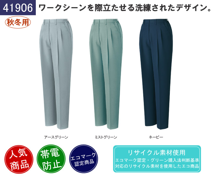 作早2015AW,41900,パンツ,自重堂,秋冬,レディース,女性用,帯電防止,ストレッチ,エコマーク認定,グリーン購入法対応,ペアコーディネート,アースグリーン,ミストグリーン,ネービー,建設,電気,精密,運送,営業