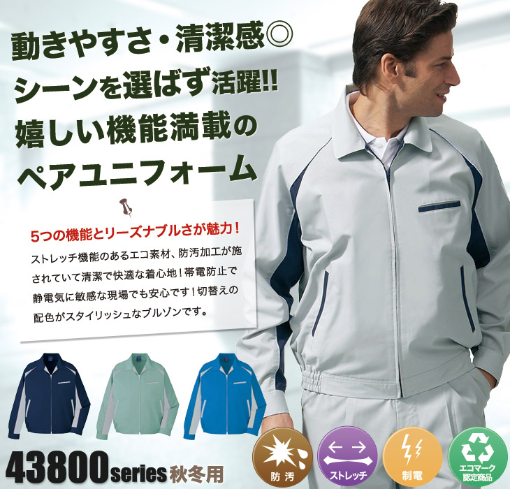 作早2015AW,おしゃれ女性,43800,長袖ブルゾン,自重堂,秋冬,,帯電防止,JIS T8118,ストレッチ,防汚加工,エコマーク認定,グリーン購入法対応,ペアコーディネート,男女兼用,ネービー,シルバー,スモークグリーン,ロイヤルブルー,建設,建築,電気,設備,ビルメン,工場,運送,倉庫,営業,配達,