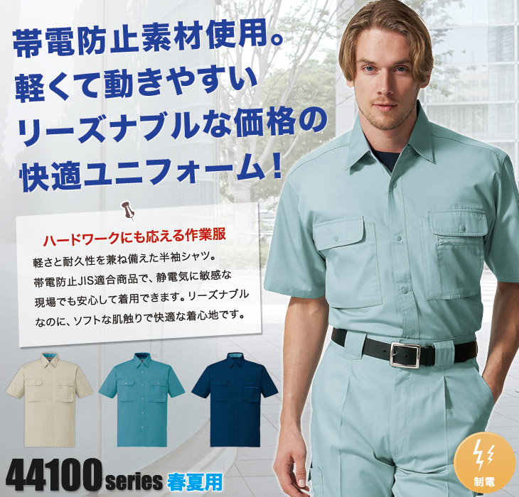 44100,半袖シャツ,自重堂,春夏,JIS T8118, 帯電防止,ソフトバーバリー,アースグリーン,ライトベージュ,ミストブルー,ネービー,5L,大工