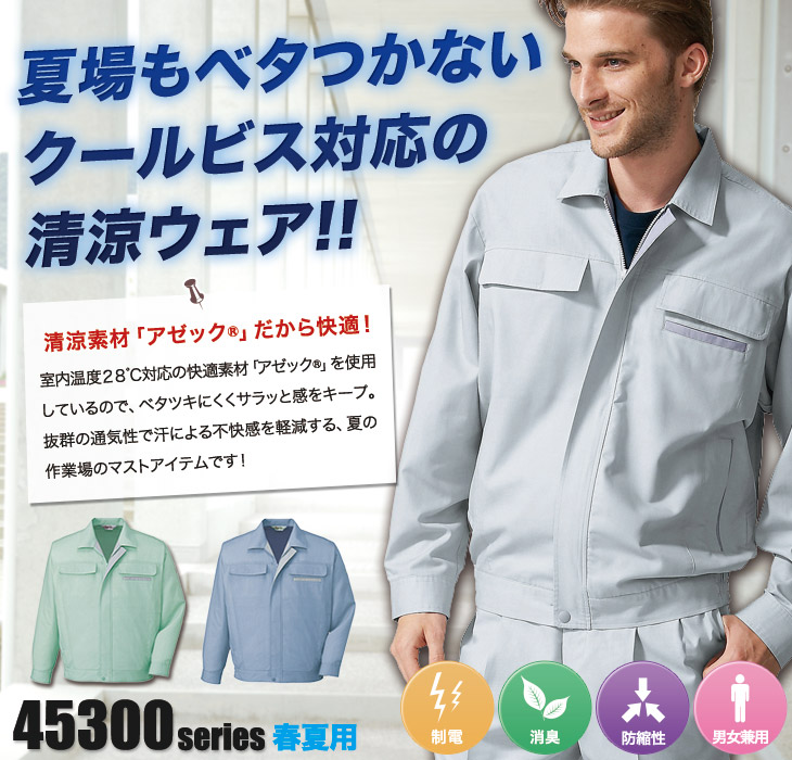 夏物バーゲン,45300,長袖ブルゾン,自重堂,春夏,帯電防止,JIS T8118, 清涼機能素材,防縮防シワ,抗菌防臭,クールビズ,アゼック,ペア,ライトグリーン,シルバー,ミストブルー,5L,精密,工場