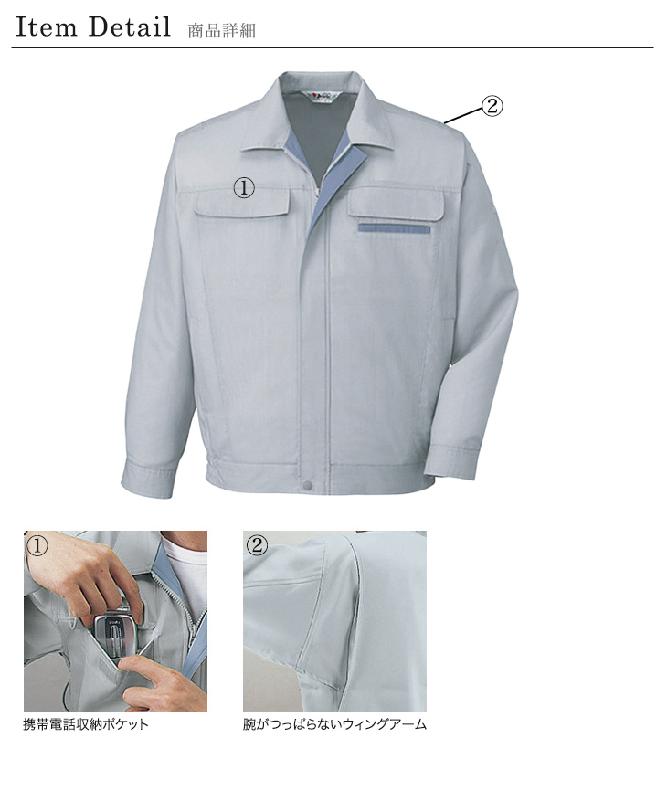 製品制電JIS T8118適合の自重堂長袖ブルゾン。通気性がよくサラッとした肌触りです。