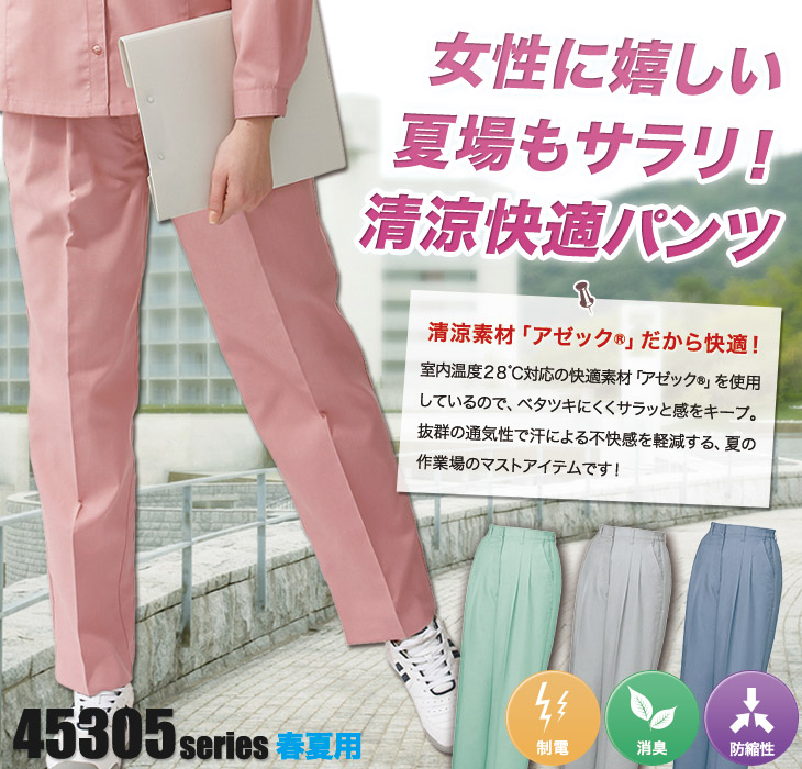 スラックス,夏物バーゲン,45300,45305,パンツ,自重堂,春夏,ツータック,女性用,レディース,涼しい,帯電防止,JIS T8118, 清涼機能素材,防縮防シワ,抗菌防臭加工,クールビズ,アゼック,ライトグリーン,シルバー,ピンク,ミストブルー,5L,精密,工場