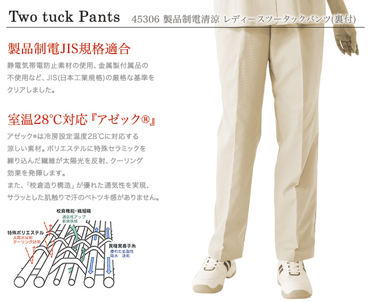スラックス,夏物バーゲン,45300,45305,パンツ,自重堂,春夏,ツータック,女性用,レディース,涼しい,帯電防止,JIS T8118, 清涼機能素材,防縮防シワ,抗菌防臭加工,クールビズ,アゼック,ライトグリーン,シルバー,ピンク,ミストブルー,5L,精密,工場