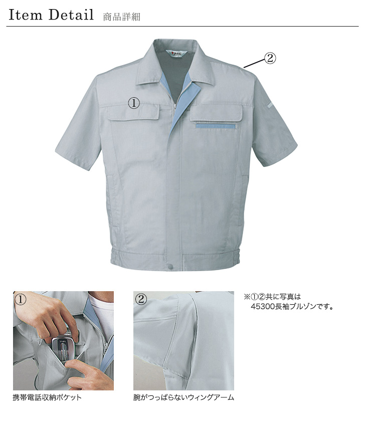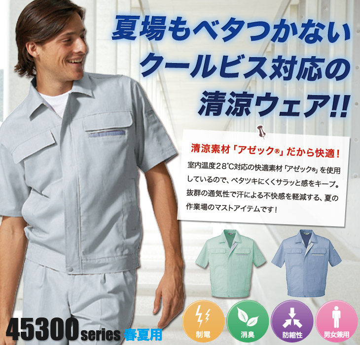 夏物バーゲン,45300,半袖ブルソン,自重堂,春夏,帯電防止,JIS T8118, 清涼機能素材,防縮防シワ,抗菌防臭,クールビズ,アゼック,ペア,ライトグリーン,シルバー,ミストブルー,5L,精密,工場,