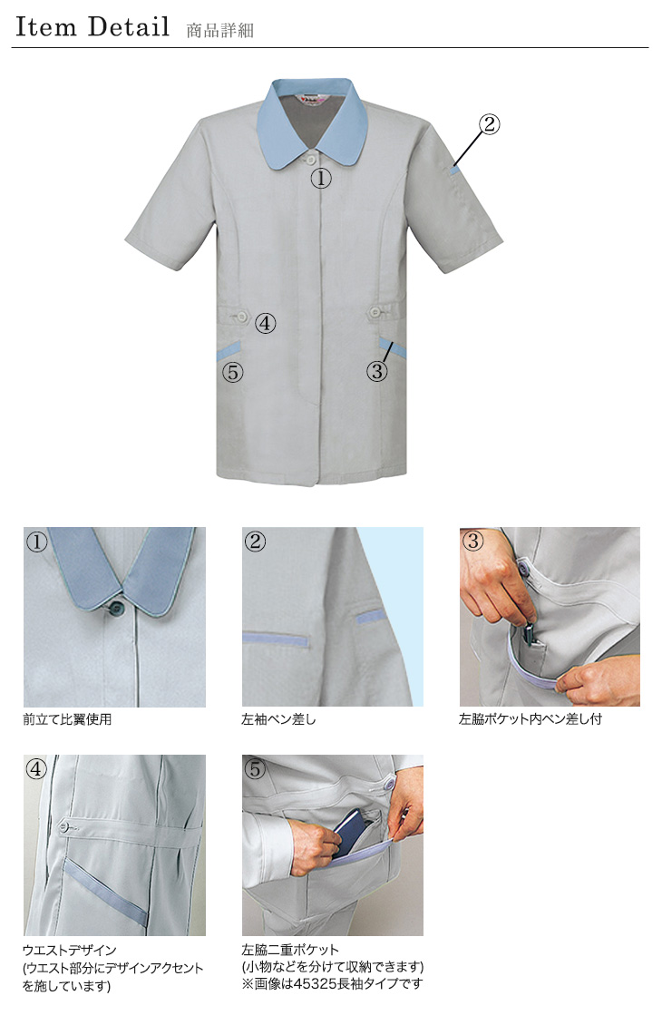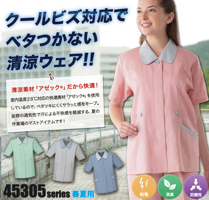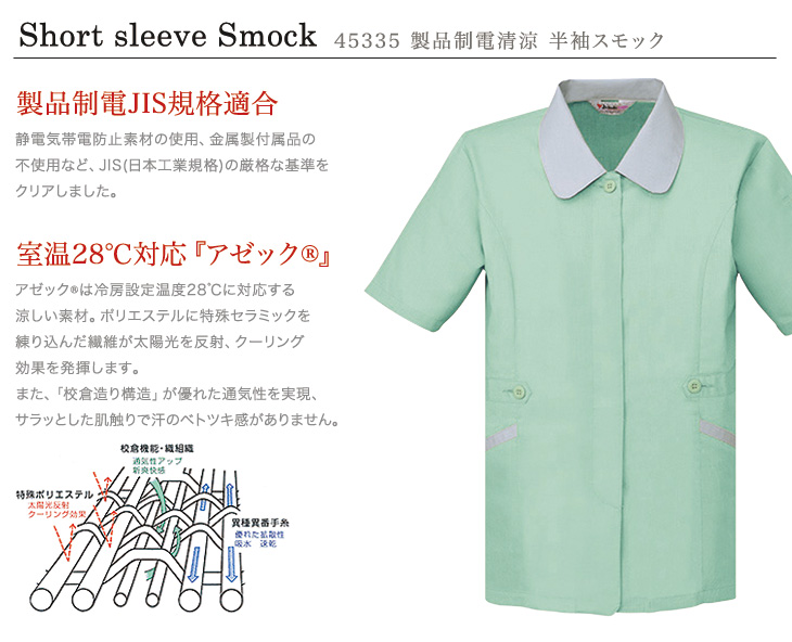 夏物バーゲン,45300,45305,半袖シャツ,自重堂,春夏,スモック,女性用,レディース,涼しい,帯電防止,JIS T8118, 清涼機能素材,防縮防シワ,抗菌防臭加工,クールビズ,アゼック,ライトグリーン,シルバー,ピンク,ミストブルー,5L,精密,工場