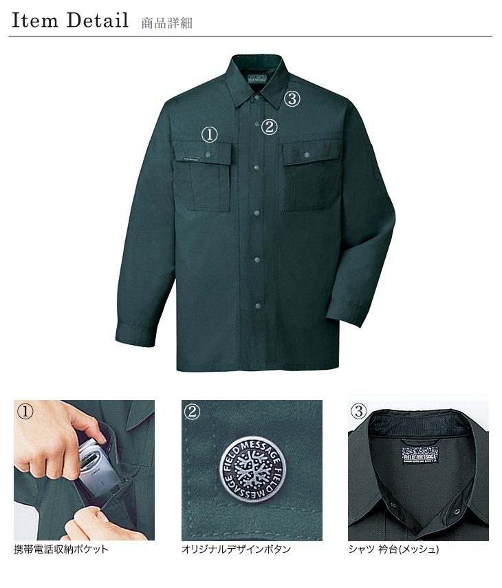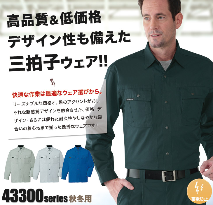 43300,47300,長袖シャツ,自重堂,春夏,アースグリーン,ロイヤルブルー,クロムシルバー,シャドーブルー,ソフトバーバリー,クールマックス,帯電防止,FIELD MESSAGE,ハード,耐久性,しなやか,リーズナブル,黒,建設,建築,営業,配達