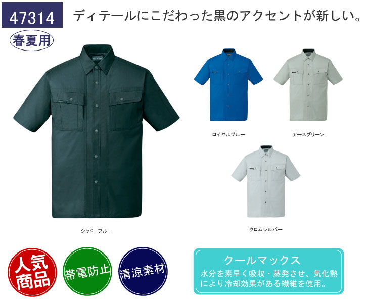 47300,半袖シャツ,自重堂,春夏,アースグリーン,ロイヤルブルー,クロムシルバー,シャドーブルー,ソフトバーバリー,クールマックス,帯電防止,FIELD MESSAGE,ハード,耐久性,しなやか,リーズナブル,建設,建築,営業,配達,