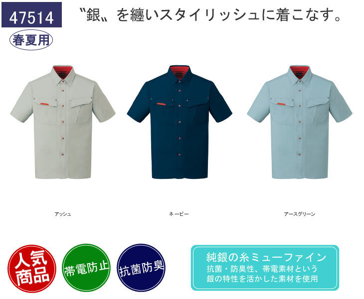 47500シリーズ,半袖シャツ,自重堂,春夏,,ネービー,アースグリーン,アッシュ,帯電防止,抗菌防臭,ミューファイン,グリーン購入法,純銀,裏綿素材,ポリ高混