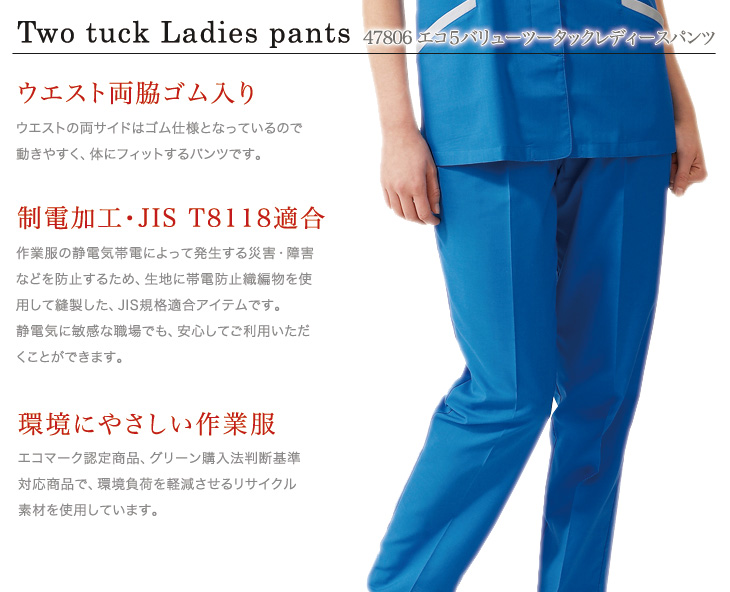 夏物バーゲン,47800,47825,パンツ,自重堂,春夏,ツータック,レディース,JIS T8118, 女性用,スラックス,ストレッチ,ウイングアームⅡ,吸汗,速乾,製品制電,エコマーク,グリーン購入法,ペアコーディネート,ネービー,シルバー,スモークグリーン,ロイヤルブルー,5L,ビルメンテナンス,清掃