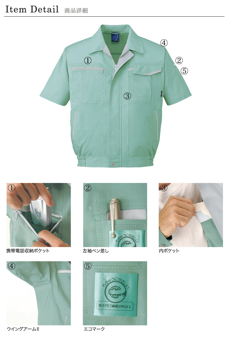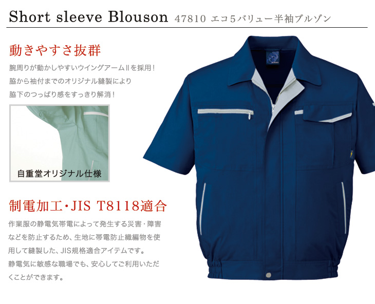夏物バーゲン,47800,半袖ブルソン,自重堂,春夏,ストレッチ,ウイングアームⅡ,吸汗,速乾,製品制電,JIS T8118, エコマーク,グリーン購入法,ペアコーディネート,ネービー,シルバー,スモークグリーン,ロイヤルブルー,5L,ビルメンテナンス,清掃,