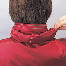 フードは巻き込み式なので、使用しない時は丸めて衿の中へしまう事ができ首元が邪魔になりません。