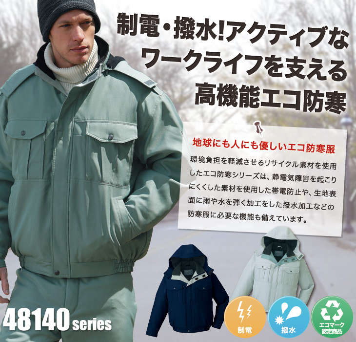 自重堂,制電防寒,防寒服,ブルゾン,自重堂,帯電防止,撥水加工,エコマーク認定,グリーン購入法対応,ケミカルリサイクル,エコペット,ミストグリーン,アースグリーン,ネービー,建設,土木,電気,設備,運送,倉庫,営業,配達
