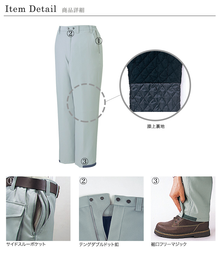 自重堂,制電防寒,防寒服,パンツ,自重堂,帯電防止,撥水加工,エコマーク認定,グリーン購入法対応,ケミカルリサイクル,エコペット,ミストグリーン,アースグリーン,ネービー,建設,土木,電気,設備,運送,倉庫,営業,配達