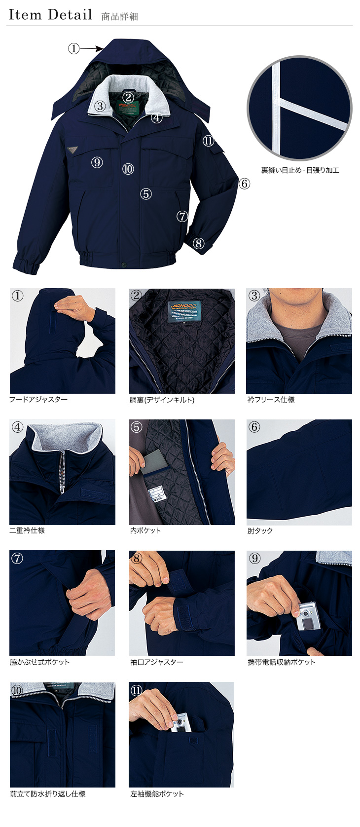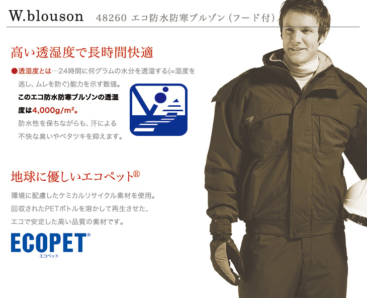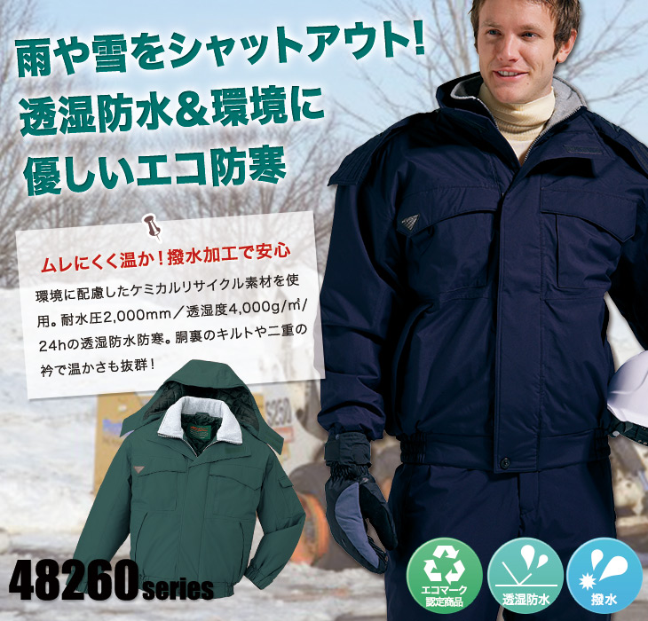 自重堂,透湿防寒,自重堂,防寒服,ブルゾン,エコマーク認定,グリーン購入法対応,撥水加工,透湿防水,耐水圧2000mm,透湿度4000g,ネービー,グリーン,エコペット,ポリエステル100%,フード付き,建築,鉄工,電気,運送,営業,