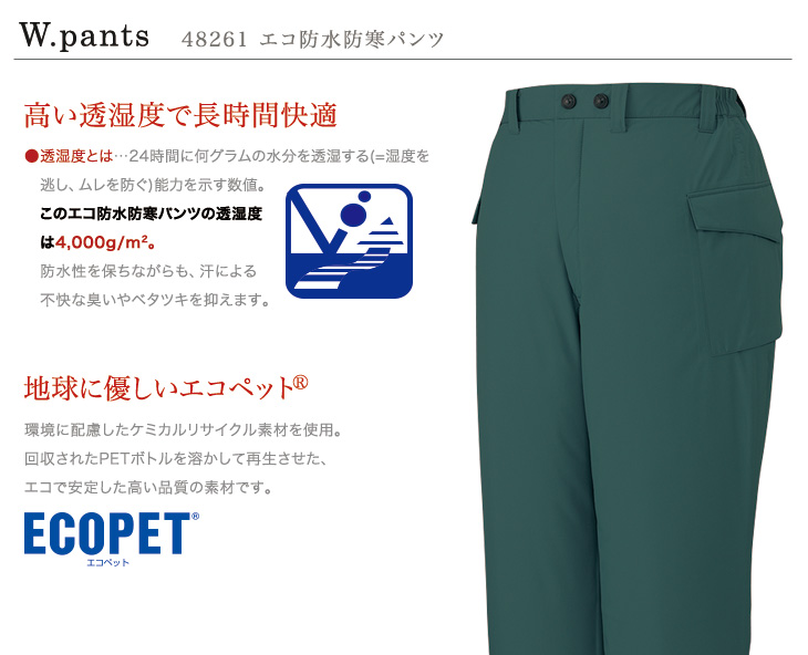自重堂,透湿防寒,防寒服,パンツ,エコマーク認定,グリーン購入法対応,撥水加工,透湿防水,耐水圧2000mm,透湿度4000g,ネービー,グリーン,エコペット,ポリエステル100%,フード付き,建築,鉄工,電気,運送,営業,