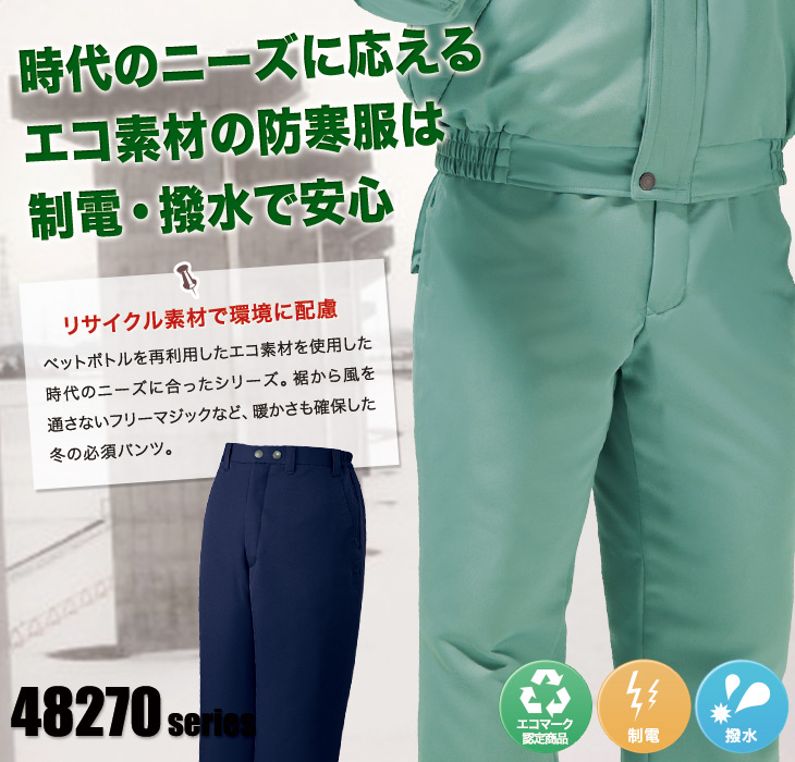 自重堂,制電防寒,防寒服,パンツ,自重堂,帯電防止,撥水加工,エコマーク認定,グリーン購入法対応,ケミカルリサイクル,エコペット,ネービー,スモークグリーン,建築,建設,土木,電気,設備,運送,倉庫