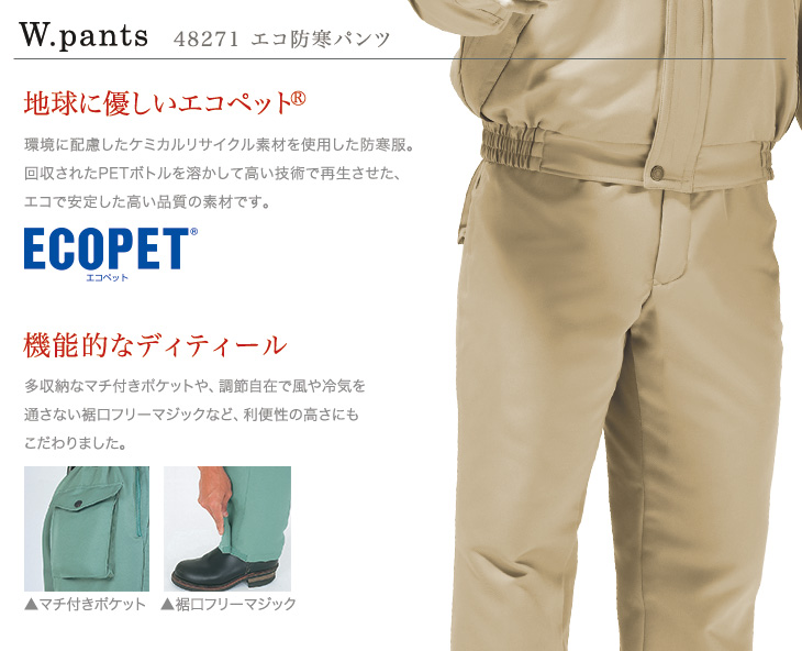自重堂,制電防寒,防寒服,パンツ,自重堂,帯電防止,撥水加工,エコマーク認定,グリーン購入法対応,ケミカルリサイクル,エコペット,ネービー,スモークグリーン,建築,建設,土木,電気,設備,運送,倉庫