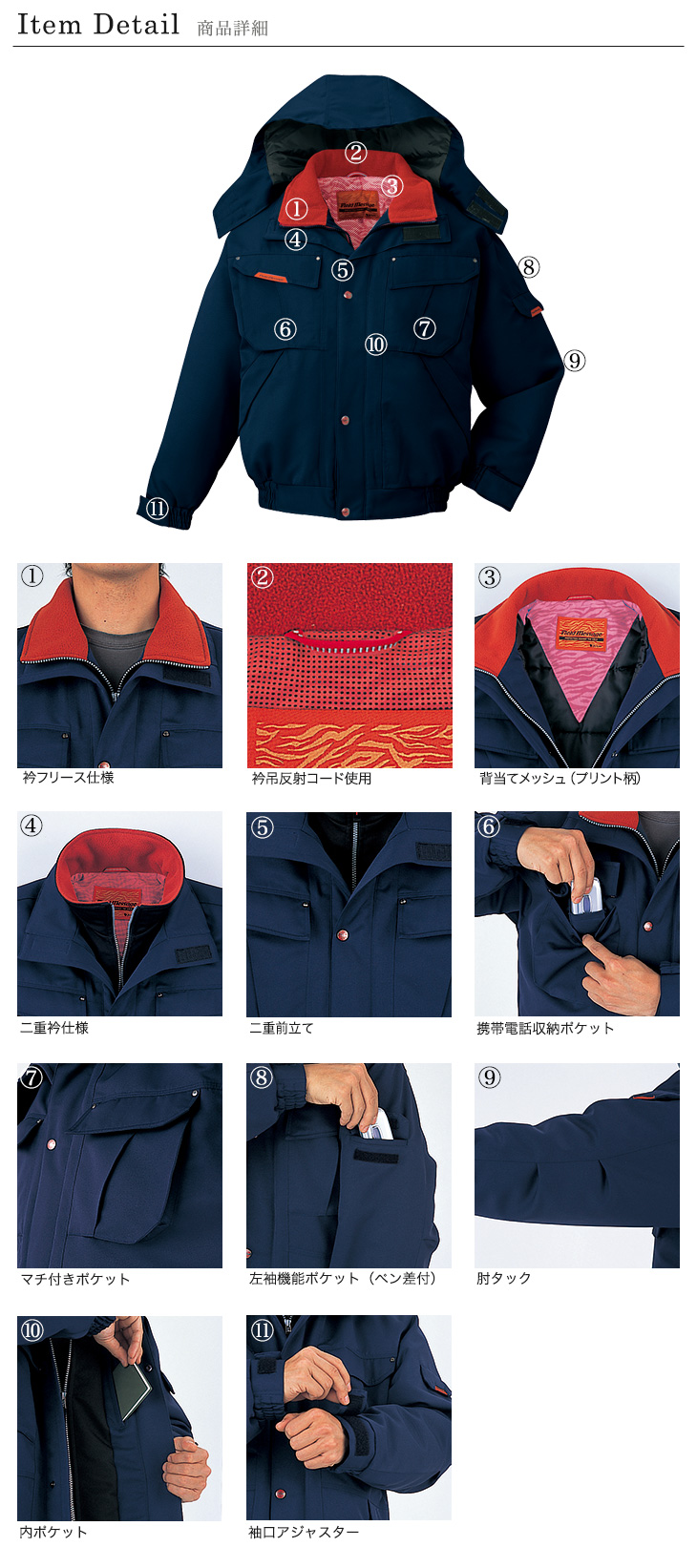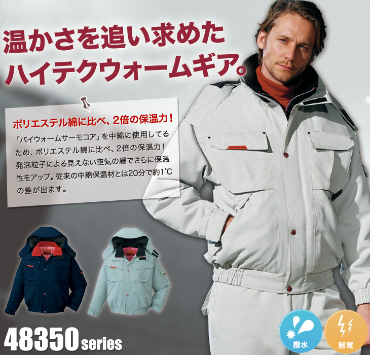 自重堂,制電防寒,防寒服,ブルゾン,フード付き,かっこいい,ネービー,アースグリーン,帯電防止,撥水加工,建設,土木,電気,設備,製造,工場,運送,倉庫,バイオウォームサーモコア,暖かい,保温