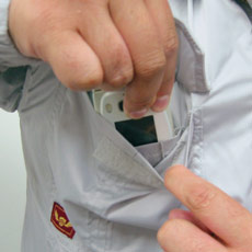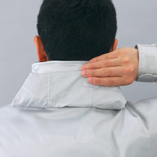 フードは巻き込み式なので、使用しない時は丸めて衿の中へしまう事ができ首元が邪魔になりません。