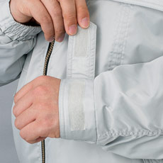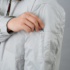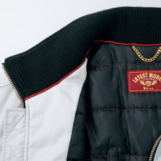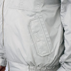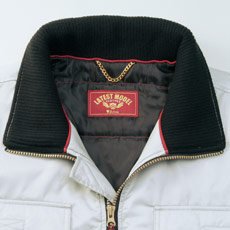 軽量なので体に負担がかからない防寒ブルゾン。衿吊はチェーン仕様の個性的でおしゃれなデザインです!生地表面には雨や水をはじく加工が施されています。