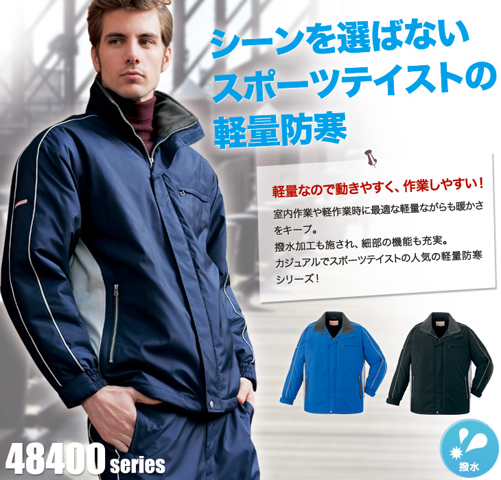 自重堂,防寒服,コート,ハーフコート,軽量,軽防寒,撥水加工,ネービー,ロイヤルブルー,ブラック,イベント,運送,倉庫,営業,配達,カジュアル