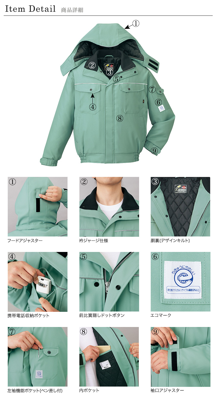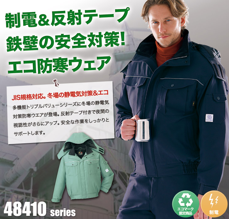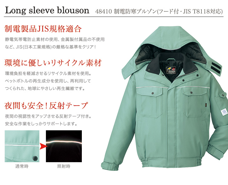 自重堂,制電防寒,防寒服,ブルゾン,ジャンパー,帯電防止,製品制電,JIS規格,JIS T8118対応,撥水加工,エコマーク認定,グリーン購入法対応,ネービー,スモークグリーン,フード付き,電気,設備,製造,工場,運送,倉庫,建設,土木