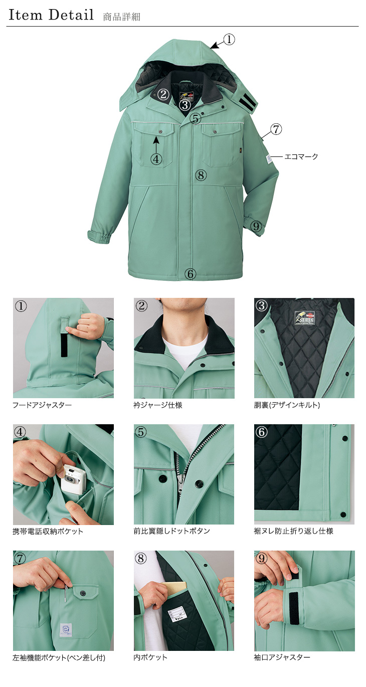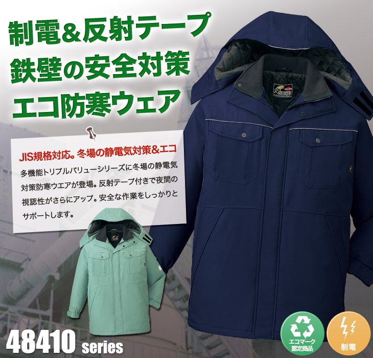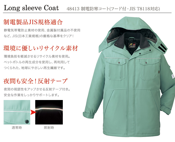 自重堂,制電防寒,防寒服,コート,フード付,帯電防止,製品制電,JIS規格,JIS T8118対応,撥水加工,エコマーク認定,グリーン購入法対応,ネービー,スモークグリーン,フード付き,電気,設備,製造,工場,運送,倉庫,建設,土木