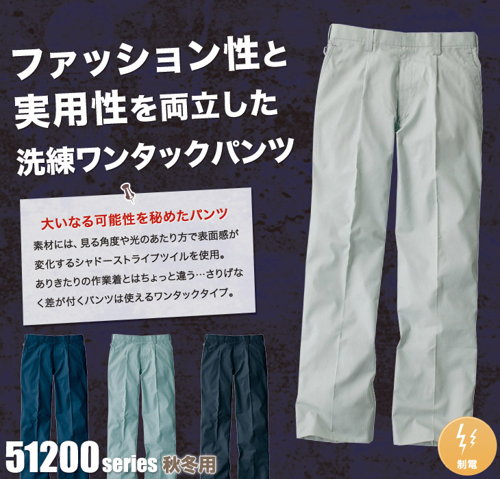 作早2015AW,おしゃれ,スラックス,大工,51200シリーズ,パンツ,自重堂,秋冬,ワンタック,Jawin,ジャウィン,ジャンパー,帯電防止,ネービー,シルバー,アースグリーン,シックブラック,建設,建築,機械,設備,農業,倉庫,営業,かっこいい