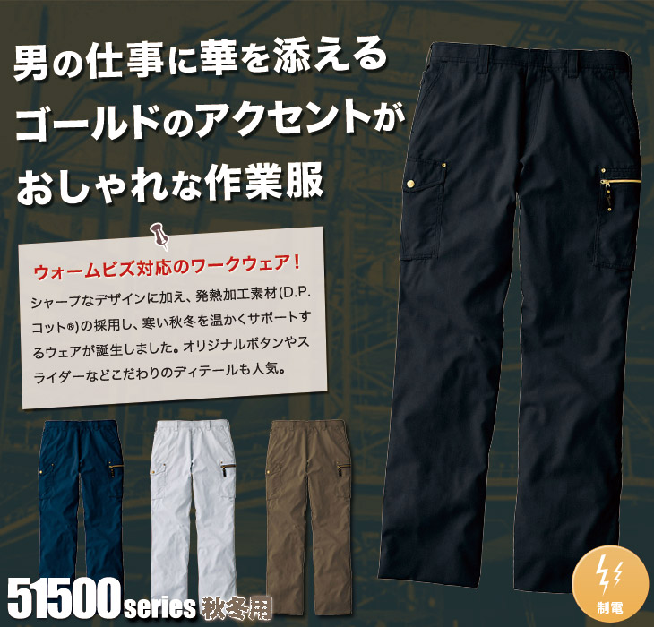 作早2015AW,おしゃれ,大工,51500シリーズ,パンツ,自重堂,秋冬,ノータック,カーゴパンツ,Jawin,ジャウィン,かっこいい,帯電防止,ウォームビズ,ブラウン,ネービー,シルバー,ブラック,キャメル,発熱加工,建設,運送,営業