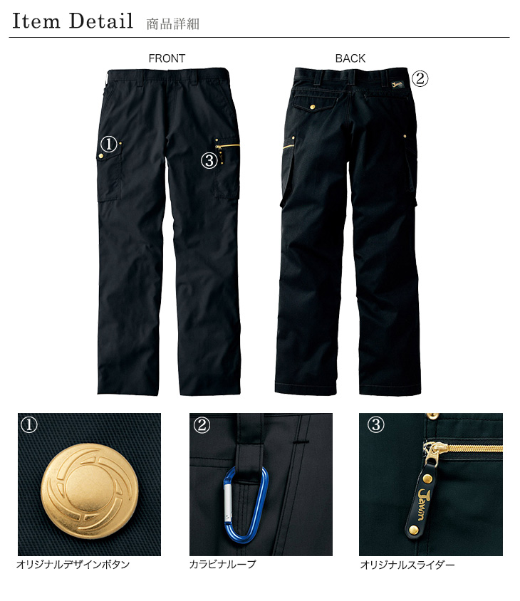 ゴールドのアクセントがおしゃれなJawinのノータックカーゴパンツ。