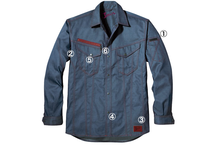 帯電防止機能で、冬場に発生しやすい静電気を抑制。 デニム調の素材感とジーニングテイストのデザインがかっこいい、新しい作業服。